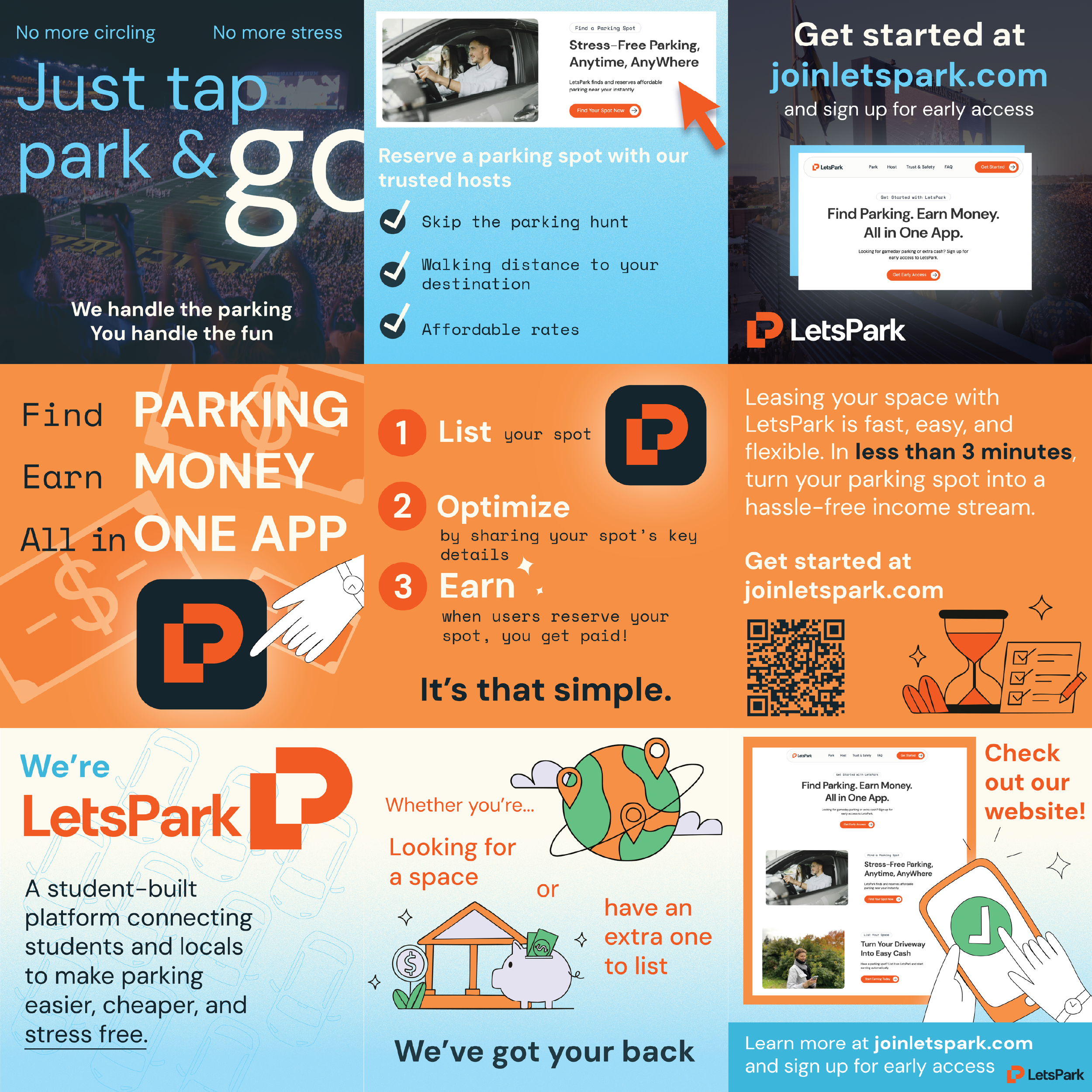 Let’s Park is a peer-to-peer parking marketplace—described as an "Airbnb-style service"—where users in college towns can rent out spots to earn passive income or find available parking. While the website was active for email signups, the company needed a strategic push to build a physical and digital presence before transitioning into a downloadable app.